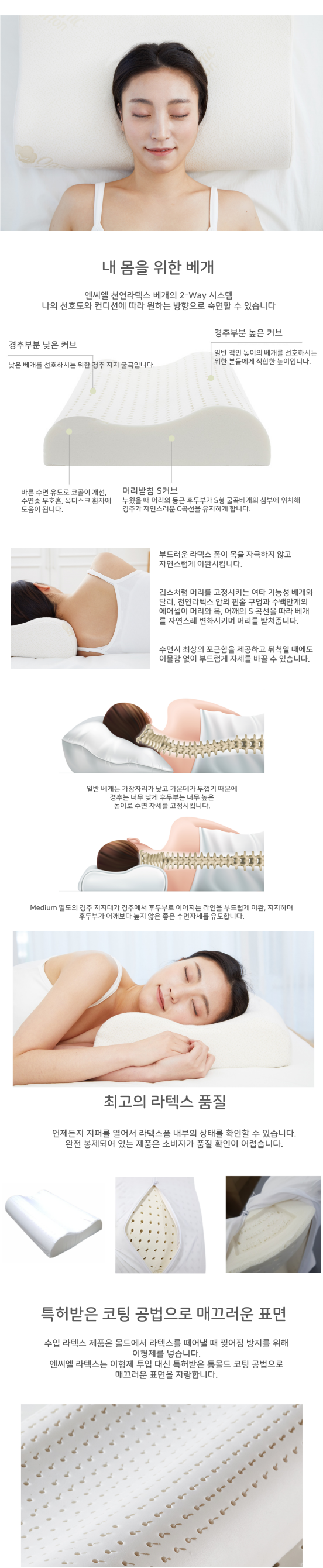 깁스처럼 머리를 고정시키는 여타 기능성 베개와 달리, 천연라텍스 안의 핀홀과 수백만개의 에어셀이 베개를